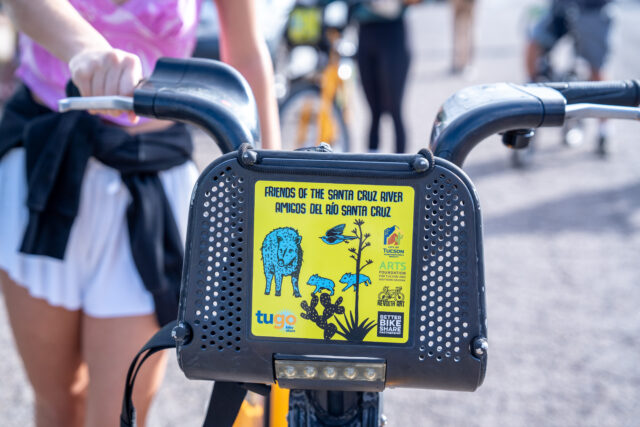 When the Better Bike Share Partnership announced the latest mini-grant round earlier this year, Tugo Bike Share applied and was awarded a grant to collaborate with the Arts Foundation for Tucson and Southern Arizona to install vinyl wraps on a bike share station and bikes, transforming them into vibrant works of art that reflect the culture and identity of Tucson’s diverse communities. The station and bikes were officially revealed during a community bike ride led by Families United Gaining Accessibility (FUGA), a mobility justice group that leads community bike rides in historically underserved areas of Tucson. Tugo is a partnership between the City of Tucson Department of Transportation and Mobility, the system operator Shift Transit, and the equipment provider Lyft Urban Solutions.