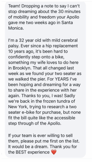 For a rider who lives in Brooklyn, a visit to Santa Monica gave her the chance to finally ride with her wife in the Apollo two-seater, since a hip replacement a decade ago left her less confident about stepping onto a bike. She shared the following message on Instagram with Veo.